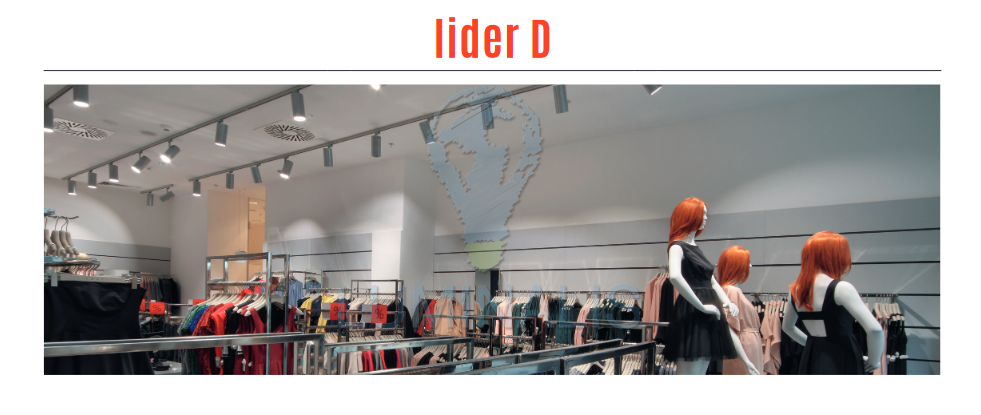 LIDER D to reflektor typu shoplight LED przystosowany jest do montażu na szynoprzewodzie bądź bazie. Konstrukcja oprawy zarówno obudowa jak i uchwyt wykonane są z odlewu aluminiowego. Prezentowana oprawa malowana proszkowo w dostępnym bazowym kolorze Grey (szarym), White (biały), Black (czarny), natomiast zgodnie z życzeniem klienta może być pomalowana na każdy kolor z palety RAL (wycena indywidualna). W reflektorze zastosowano odbłyśnik oraz statecznik elektroniczny EVG. Reflektor można ustawiać w dowolnym kierunku w zależności od potrzeby lub chęci oświetlenia danego miejsca, dlatego często stosowany w różnorodnych aranżacjach pomieszczeń. Przy zastosowaniu szynoprzewodu trójfazowego oferowanego w sklepie i dedykowanego do reflektora LIDER D mamy możliwość sterowania każdym obwodem osobno.